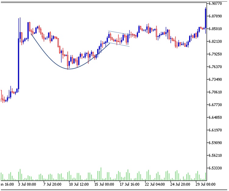 Pongámosle números a nuestro ejemplo del USDSEK con el patrón de taza con asa. La gráfica es del 2014, la tendencia era alcista de ya varias semanas, y a principios de julio, periodo que se muestra, tuvo un incremento aun más fuerte. Esta vela va de 6.71308 a 6.82746. Vienen algunos otros periodos con ligeros incrementos, y justo empieza una ligera caída, que es donde inicia la “U” de la taza.