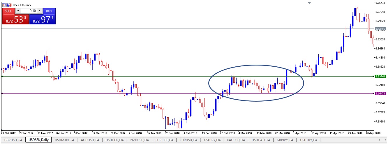 Esta gráfica es del par USDSEK. El patrón rectangular se forma entre el 28 de febrero del 2018 y el 28 de marzo del 2018. Un mes exactamente. En este caso lo que terminó rompiéndose es la resistencia, nivel que más tarde sirvió de soporte.