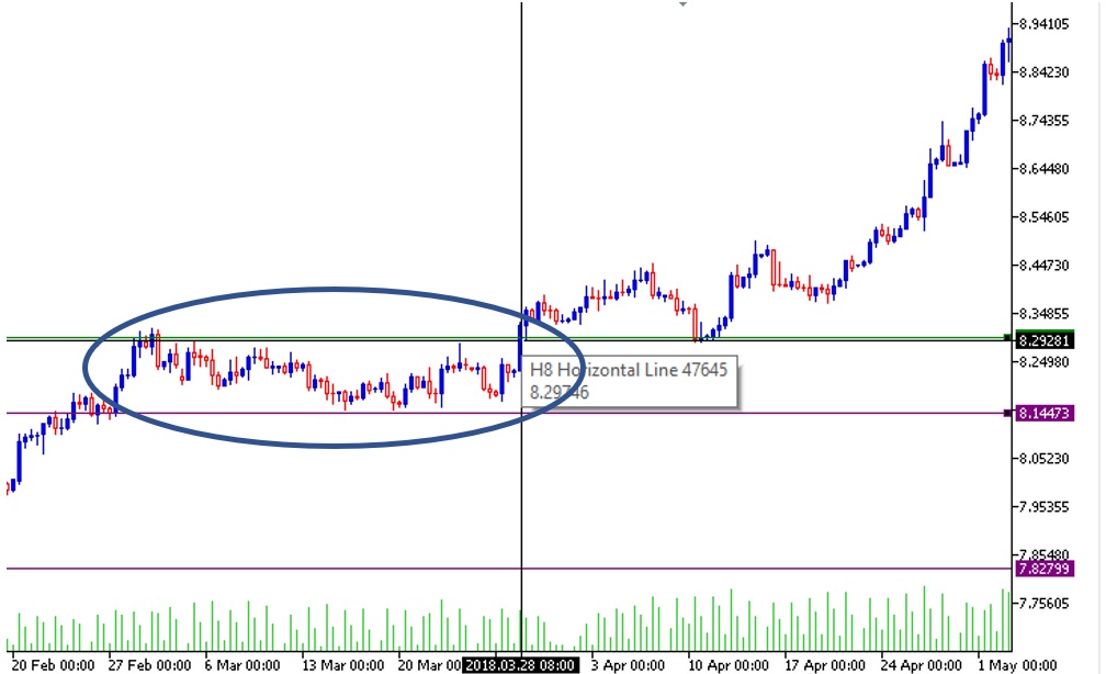 Entonces, para que se considere un patrón rectangular, el movimiento debe ser lateral, por un periodo considerable de tiempo. Un mes califica como considerable. El precio se movió dentro del rango establecido. La línea inferior de soporte del rectángulo está marcada en 8.14474. Se considera importante porque además de ser soporte en el patrón, también fue soporte anteriormente y así mismo sirvió como resistencia cuando el soporte se rompió. Ahora, el nivel de la formación rectangular marcado como resistencia, es considera importante porque anteriormente fue también un nivel de soporte, y volvió a cumplir como tal después de la formación. Este nivel está en 8.29746.
