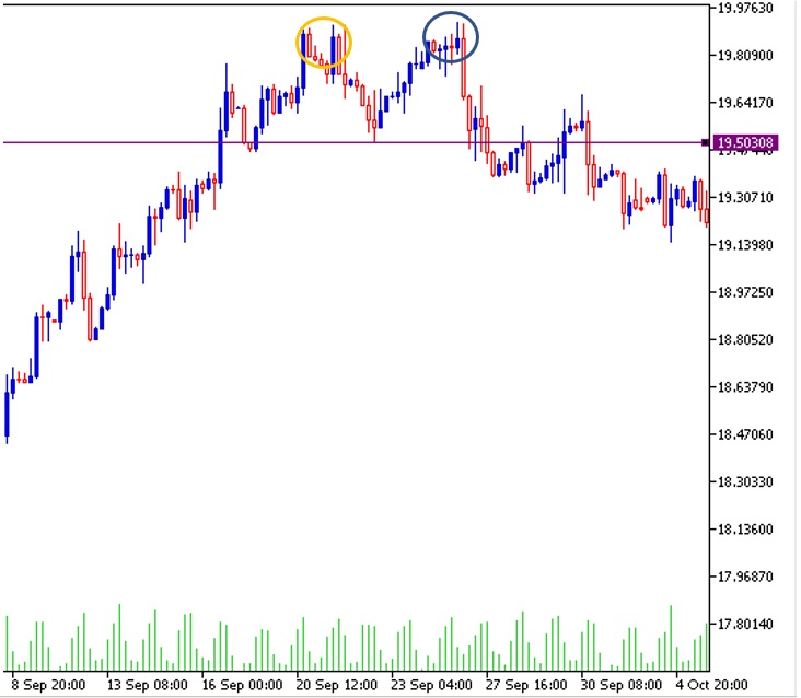 Como se mencionó, en los patrones de doble techo se marcan dos picos en la parte superior de la gráfica, que son los techos. En nuestra gráfica el primer techo está marcado por un círculo anaranjado, mientras que el segundo por un círculo azul.