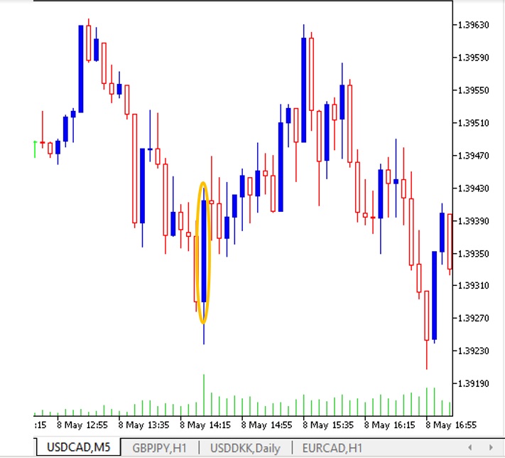 Usaremos el reporte de nóminas no agrícolas del 8 de mayo de 2020. Bajo todo el caos del Covid 19, el NFP cobró aún más relevancia, además, los focos estaban encima por que las solicitudes iniciales de desempleo venían de semanas muy malas, y este reporte de empleo de nómina no agrícola reflejaría los desastrosos números de abril de 2020. Para este ejemplo usaremos el USDCAD con velas de 5 minutos.