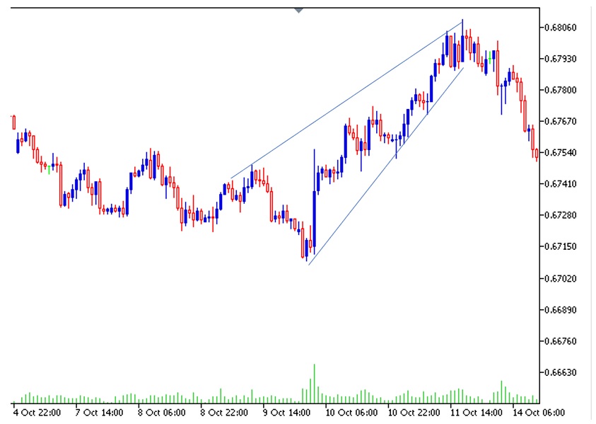 Las formaciones de cambio de tendencia o patrones de cambio de tendencia de cuña ascendente ocurren en periodos largos con 50 velas o más. Aunque van al alza, el volumen va reduciéndose. Alrededor del tope, el volumen en las velas ascendentes es casi nulo, lo que indica que un cambio de tendencia es inevitable. En nuestra gráfica mostramos el AUDUSD, y aunque podrían dibujarse distintos patrones de cambio de tendencia, la cuña es más que obvia. Después de la formación de la cuña, la caída viene inmediatamente después.
