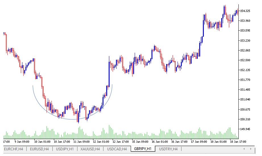 Entre los patrones de cambio de tendencia, tenemos uno llamado sopera, platillos o Suelo Redondeado. Las figuras chartistas de cambio de tendencia de suelo redondeado generalmente se forman cuando viniendo de una tendencia bajista, las velas se acomodan de modo que parece eso, un suelo redondeado, luego, el precio rebota para iniciar un mercado alcista. Veamos un ejemplo con el GBPJPY: