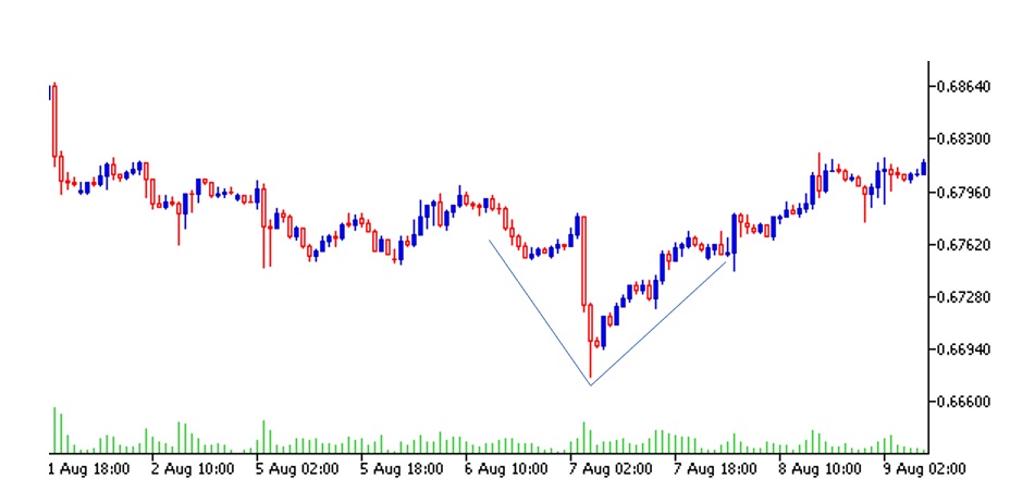 Otra de las figuras chartistas de cambio de tendencia o patrones de cambio de tendencia es el Patrón de Vuelta en V. El patrón V o la formación de vuelta en V, como su nombre lo indica es un patrón que forma una “V”. Es una de figuras chartistas de cambio de tendencia relativamente poco comunes, pero vale la pena revisar. Muestra un cambio agresivo de tendencia y aparece cuando venimos de una tendencia a la baja y de pronto esta cambia en sentido opuesto.