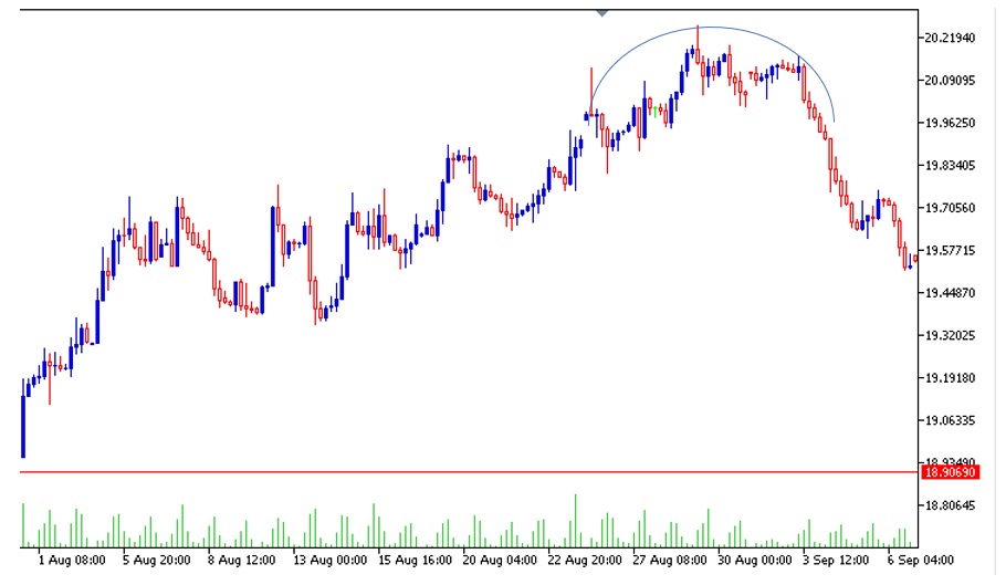 Otra de las formaciones de cambio de tendencia importantes es el Techo Redondeado. Es igual al suelo redondeado, pero con las posiciones opuestas, es decir, se da en un mercado alcista. Pero la lógica es igual. Veamos el ejemplo con el USDMXN: