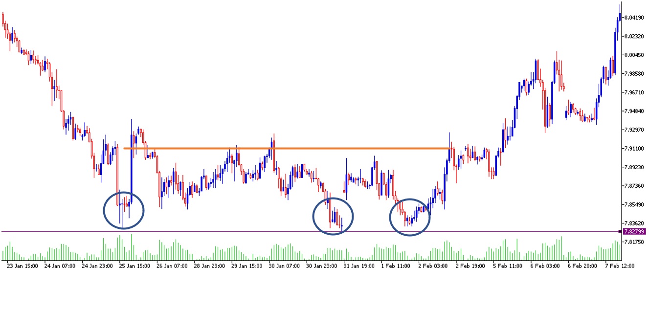 El par venía, como dice la teoría, de una tendencia bajista fuerte. El primer piso se forma cerca de 7.82799, nivel marcado por la línea morada. Esto ocurrió el 25 de enero. El rebote viene acompañado de un incremento en el volumen. El rebote superó por algunas cuantas horas la línea de resistencia marcada en 7.911. Pero rápidamente regresó para tener movimientos laterales por debajo. Hay que aclarar que en el análisis técnico es lógico que los niveles no sean exactos, y en este caso los pisos formados no estarán al mismo nivel de precios entre sí, pero sí deben de ser extremadamente similares.