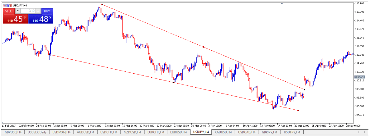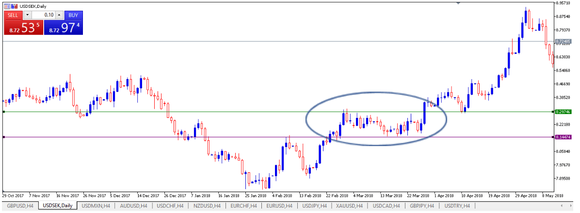 En la gráfica del USD SEK se formó un patrón rectangular que duró del 28 de enero de 2018 al 28 de marzo de 2018. Exactamente un mes. Vemos como después rompió la resistencia y, días después este mismo nivel, sirvió de soporte.