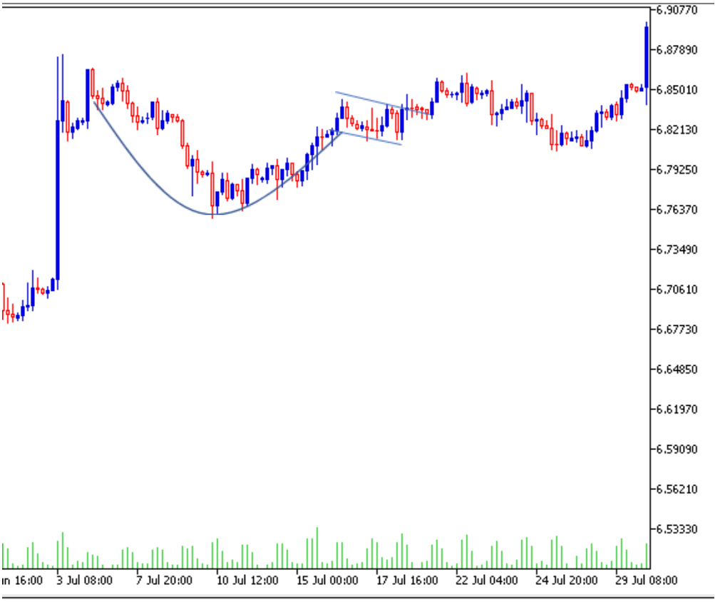 Entre las formaciones de continuación de la tendencia encontramos la formación de Taza con Asa o el patrón gráfico de Taza con Asa. Es exactamente lo que su nombre indica, las formaciones de las velas se asemejan a la vista lateral de una taza y su asa. Este patrón de continuidad de tendencia es una de las formaciones de continuación de la tendencia más básicas. La taza tiene forma de “U”, y el asa tiene una ligera inclinación con tendencia bajista. Dado su estatus de patrón de continuidad de tendencia usado principalmente en tendencias alcistas, se usa para identificar nuevas oportunidades de compra, aunque ya esté iniciada la tendencia.