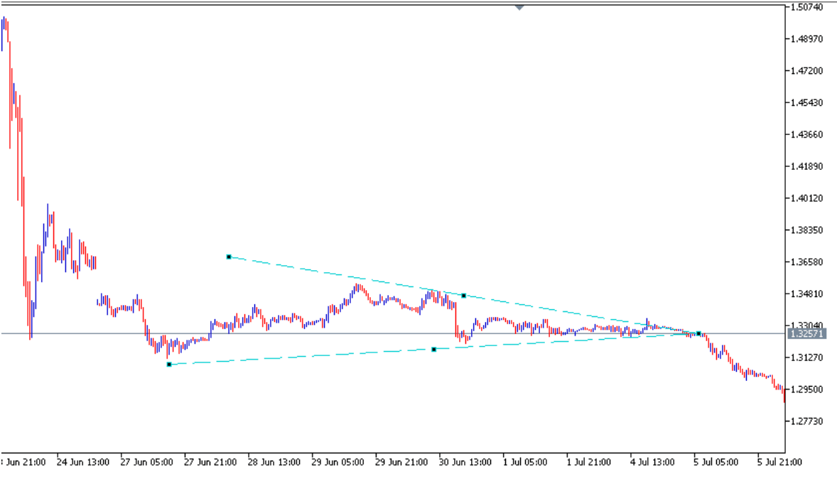 Este es un gráfico del GBPUSD, como vemos, la tendencia venía en caída, sin embargo, se detuvo dicha caída, y se empezó a formar un triángulo, en cuanto rompió la línea de tendencia inferior, la tendencia bajista continuó.