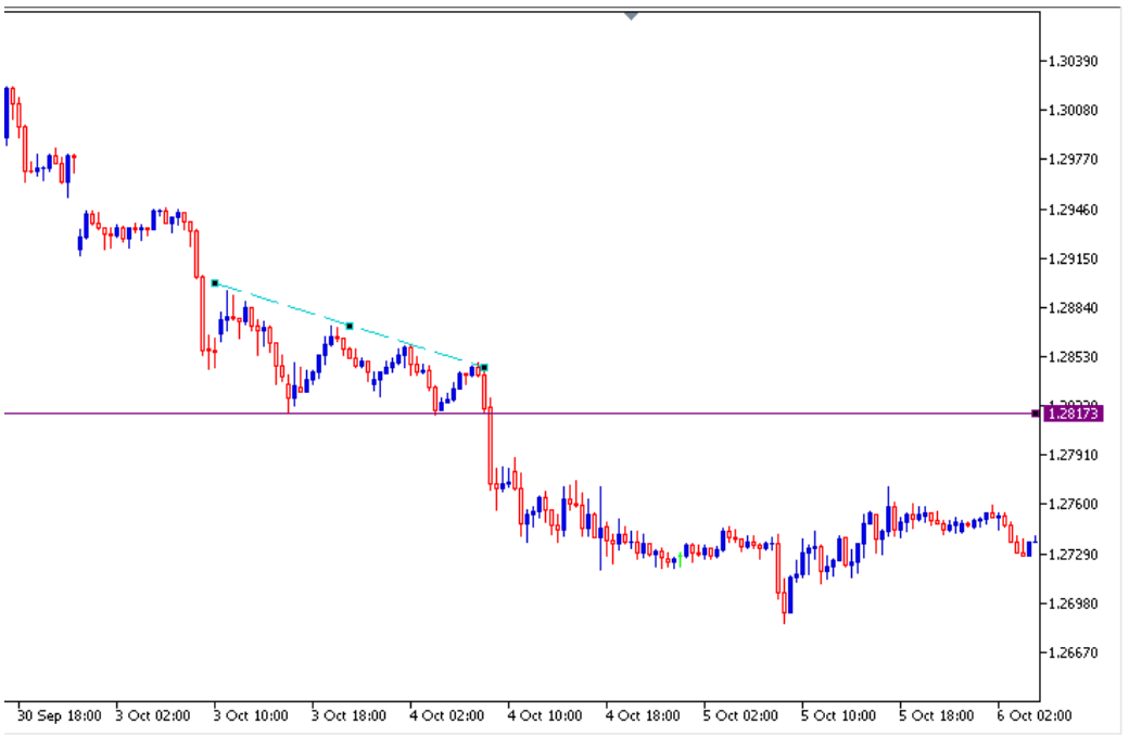Como vemos en el gráfico del GBPUSD, la tendencia era bajista, pero se encontró un momento en el que no se pudo rebasar el nivel de 1.28, por lo que se considera un soporte, sin embargo, los máximos cada vez fueron más bajos hasta que el soporte fue roto, y la caída continuó.