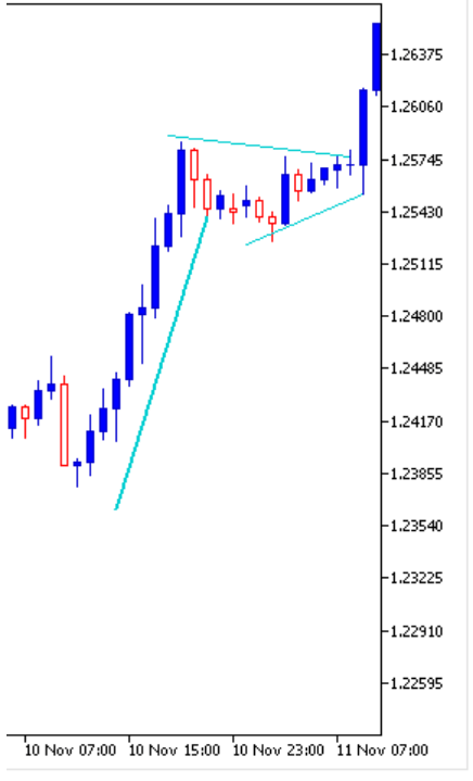 Ejemplo de la expansión de triángulos en el análisis técnico, banderas y banderines: A continuación, vemos un ejemplo de un banderín con el GBPUSD, como vemos, viene un alza violenta del precio y luego algunos periodos de una tendencia más bien lateral que si ponemos atención forman un banderín, luego, como se pronosticaba, el alza continúa.
