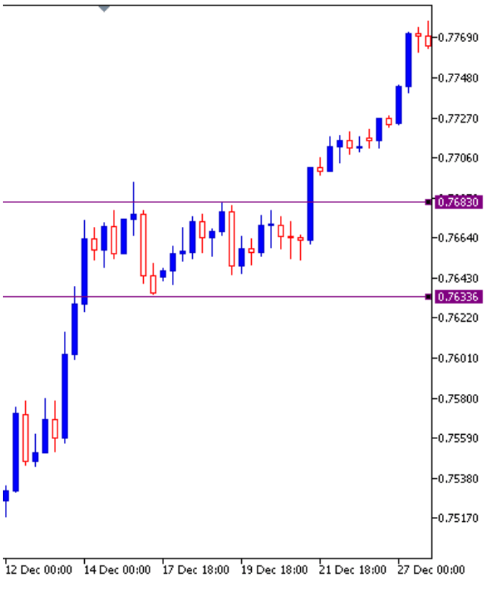 En el caso del NZDUSD, par que veremos a continuación, el precio viene de una tendencia alcista y luego tres periodos donde el periodo sube más violentamente, luego, el precio entra en tendencia lateral, formando una bandera, y en cuanto el nivel superior (resistencia) se rompe, la tendencia alcista continúa.
