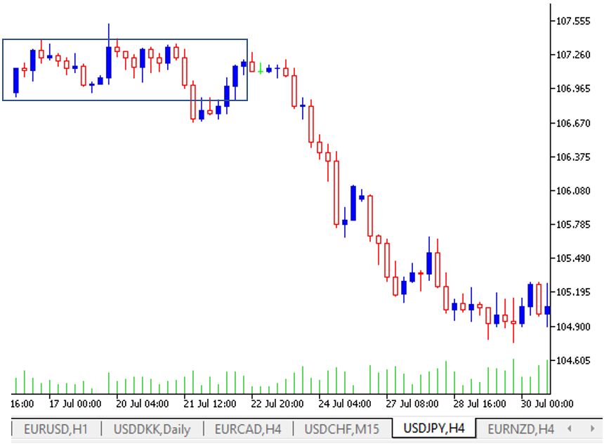 Los movimientos anteriores al Dojise podrían considerar laterales, los hemos señalado en medio de un rectángulo cuyas líneas denotan soporte y resistencia. Como se puede apreciar, la mayoría de los periodos pueden dibujarse perfectamente dentro de la figura geométricay solo cuatro velas salen de esta, aunque no por completo, una parte de estas siguen dentro del nivel de soporte señalado por el rectángulo. Justamente las velas cuyos cuerpos intentan romper tiene direcciones opuestas, confirman el ambiente de indecisión del mercado. Tras cuatro periodos de una pequeña alza de precios aparece una vela roja y luego el Doji, otra vez, recordando que no hay dirección clara.